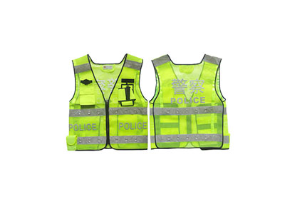 材質:熒光黃眼布反光帶:5cm晶格反材料,反光帶上鑲嵌LED燈,前擺兩側、后背反光字采用燙印工藝,前擺兩側分別印有“POLICE”,后背印有“警察POLICE”。