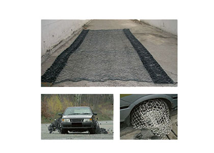 阻截網是主要針對輪軸設計的一種新型阻車技術。網上的釘子刺入輪胎后,輪胎的運動會將整張網裹起,隨著車輛的前進,阻截網會在車軸上越繞越緊,從而使車輛迫停。阻截網的阻車效率更高,且重量輕,易于布置。不會對駕駛人員造成致命損傷
