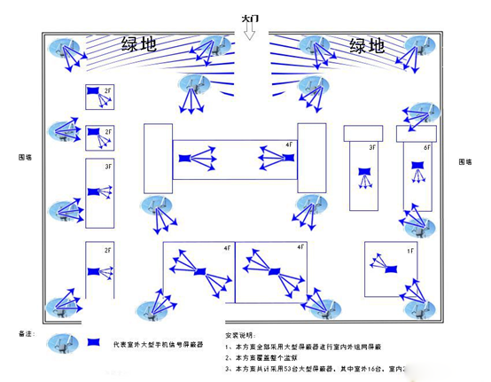 由上圖可以看出,采用新型智慧型屏蔽器,僅需4臺即可完成整個區(qū)域的無縫屏蔽,基于智慧型屏蔽的工作原理,不受周邊運營商基站信號的影響可以做到無縫無死角嚴格屏蔽。