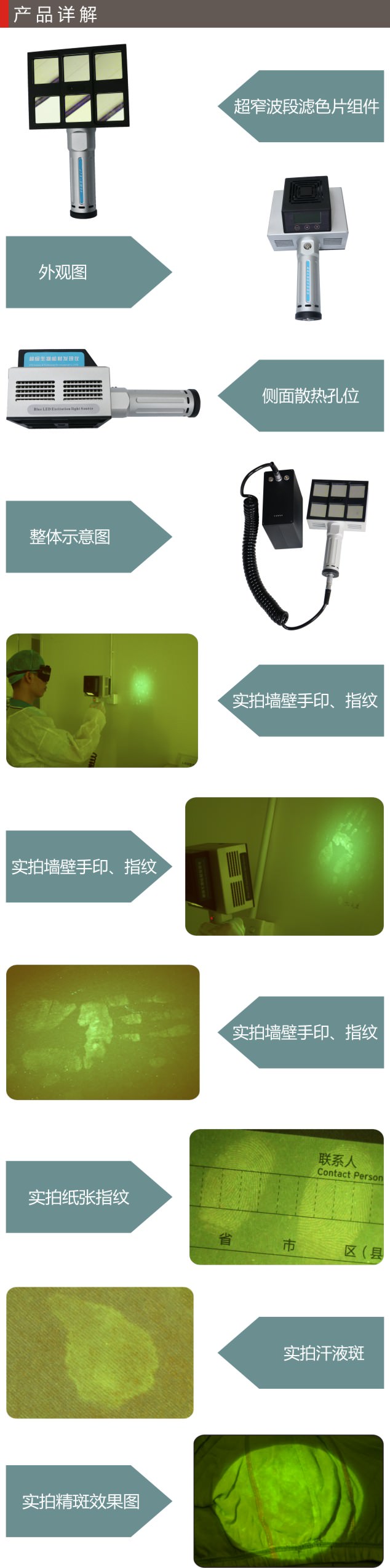 產品用途:超級物證發現儀,用于現場大范圍搜索精斑、尿液斑、唾液、陰道分泌物、血斑等生物檢材(不破壞DNA)及纖維、脫落細胞、骨骼牙齒碎片、油漆碎片、潛在手印、射擊殘留物等物證,也可以無損直接顯現部分客體上的手印指紋,潛在痕跡搜索,纖維,茚三酮/DFO羅丹明等處理過熒光染色等,大大提高現場物證發現提取率和區別能力。